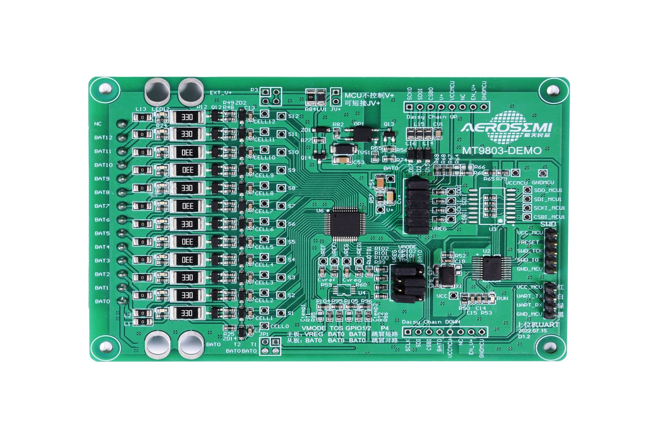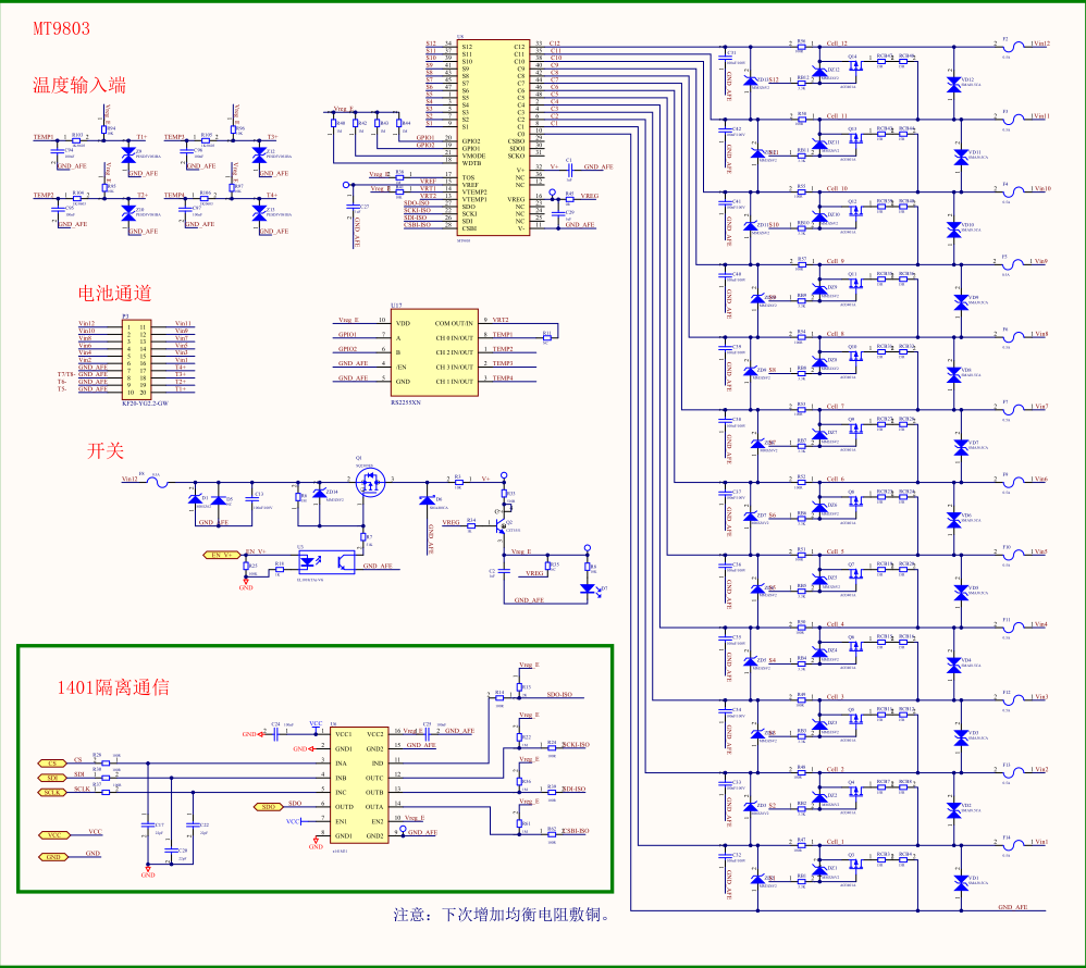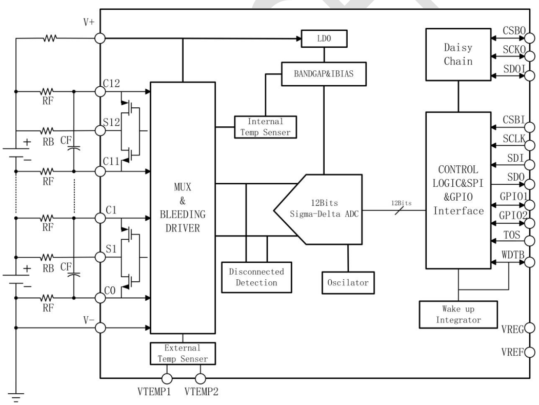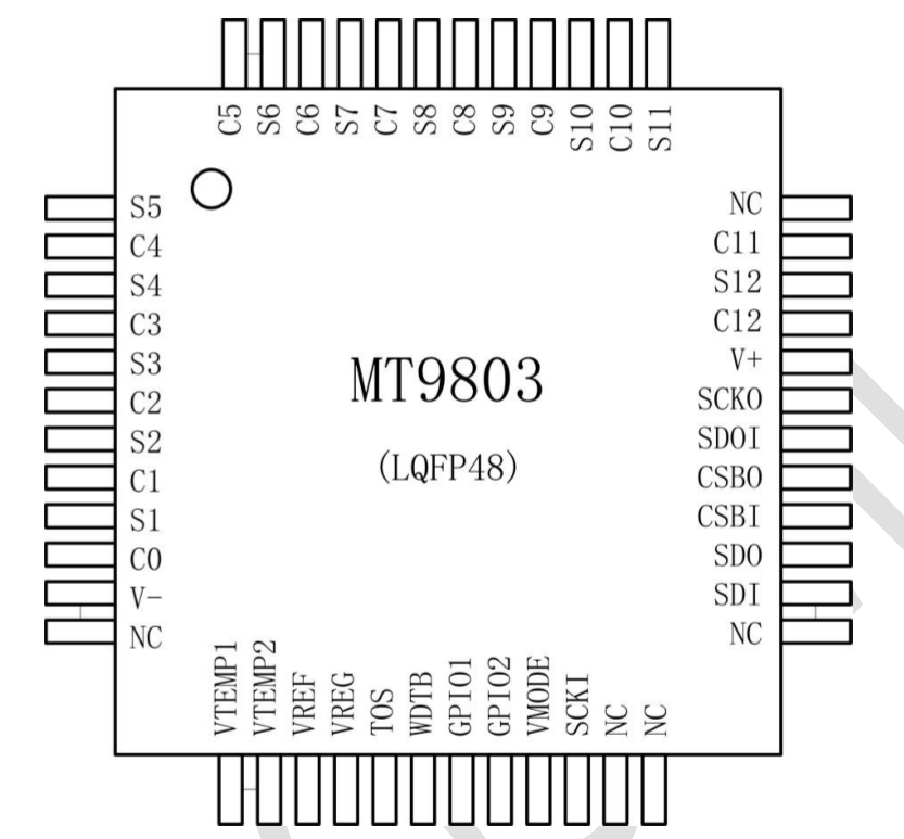 MT9803 是一款低功耗芯片,工作時電流小于 1.3mA,待機模式下小于 35uA。最高可以支持 12 節(jié)串聯(lián)電池的信息測量,總的電壓測量范圍為 10~60 V.內(nèi)部包括 12路的 12位電壓采集 ADC,分辨率 1.5mV。同時還包含一個片內(nèi)溫度采集通道,兩個外部溫度采集通道,可在 13ms 的時間內(nèi)轉(zhuǎn)換全部 12 節(jié)串聯(lián)鋰電池的電壓。MT9803 內(nèi)部集成了電池均衡MOSFET 最大均衡電流為 20mA,并且可以驅(qū)動外部 MOSFET,從而實現(xiàn)更大的均衡能力。同時,MT9803 可以支持多節(jié)菊鏈式連接并進行通信,以監(jiān)測長串串接的鋰電池組。芯片集成了開路連接監(jiān)測功能,更好的保證電池的使用安全。芯片通過帶有包誤差校驗的 SPI通信協(xié)議與主控 MCU 進行數(shù)據(jù)通信,通信時鐘頻率最高可達 1MHz。