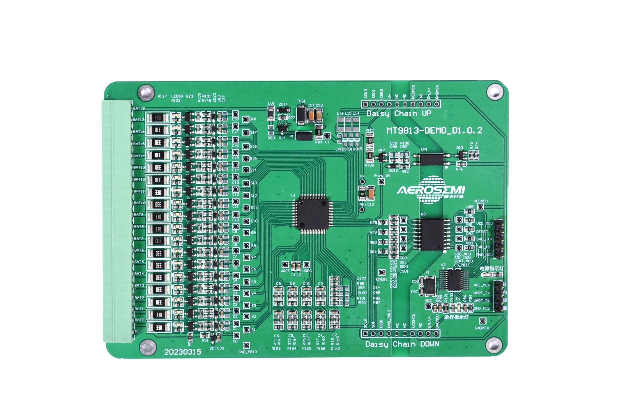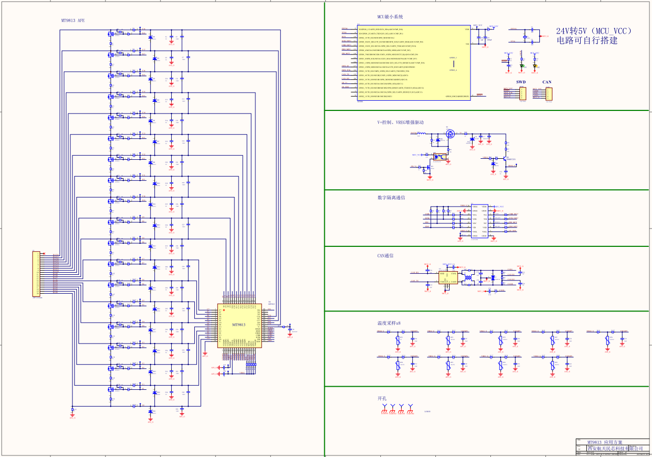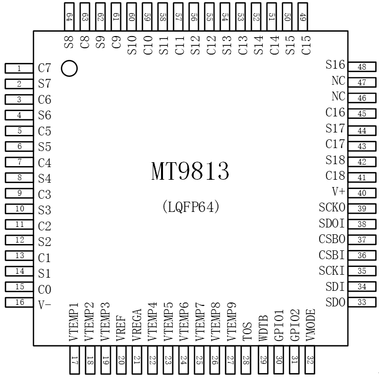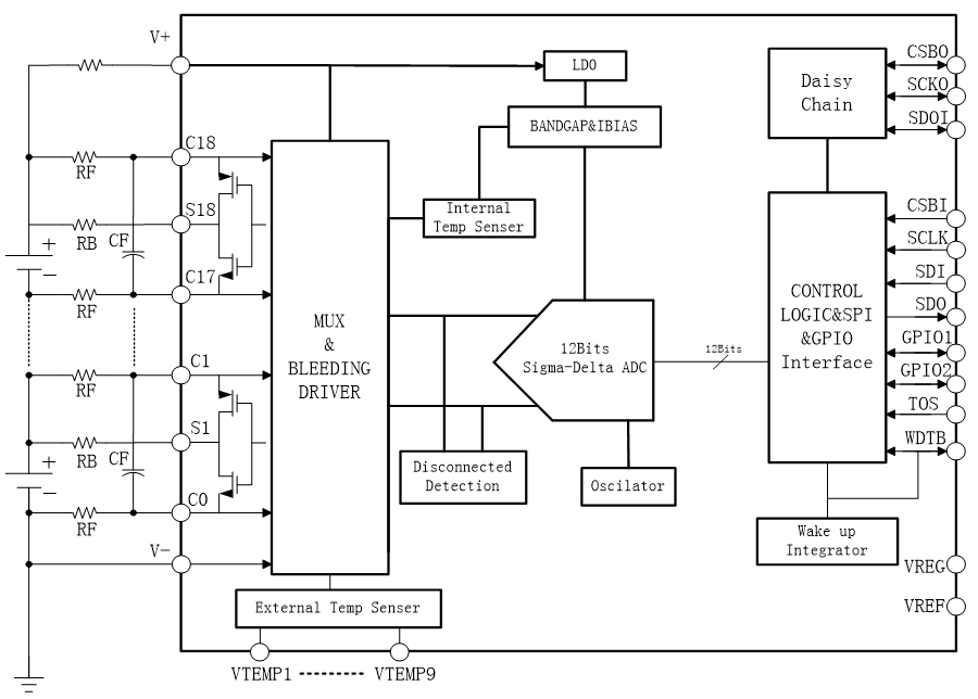 MT9813 是一款低功耗芯片,工作時電流小于 1.3mA,待機(jī)模式下小于 35uA。最高可以支持 18 節(jié)串聯(lián)電池的信息測量,總的電壓測量范圍為 10~90 V.內(nèi)部包括 18 路的 12 位電壓采集 ADC,分辨率 1.5mV。同時還包含一個片內(nèi)溫度采集通道,9 個外部溫度采集通道,可在 21ms 的時間內(nèi)轉(zhuǎn)換全部 18 節(jié)串聯(lián)鋰電池的電壓。MT9813 內(nèi)部集成了電池均衡MOSFET 最大均衡電流為 20mA,并且可以驅(qū)動外部 MOSFET,從而實(shí)現(xiàn)更大的均衡能力。同時,MT9813 可以支持多節(jié)菊鏈?zhǔn)竭B接并進(jìn)行通信,以監(jiān)測長串串接的鋰電池組。芯片集成了開路連接監(jiān)測功能,更好的保證電池的使用安全。芯片通過帶有包誤差校驗(yàn)的 SPI 通信協(xié)議與主控 MCU 進(jìn)行數(shù)據(jù)通信,通信時鐘頻率最高可達(dá) 1MHz。