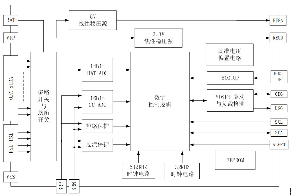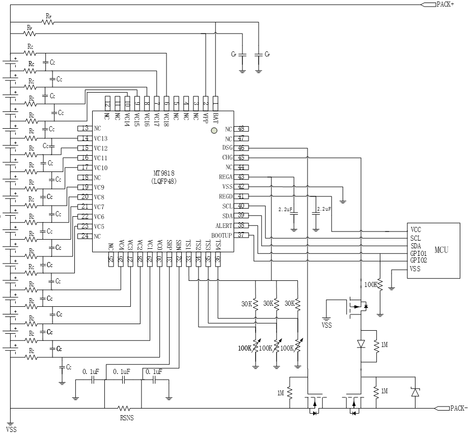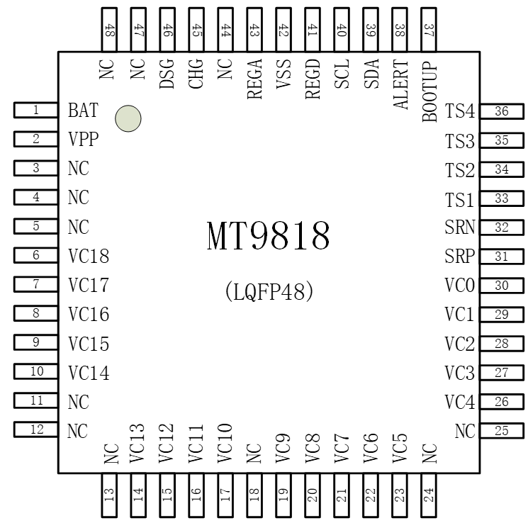MT9818 是一款低功耗芯片,工作時(shí)電流小于 500uA,待機(jī)模式下小于 20uA??梢灾С?8~18 節(jié)串聯(lián)電池的信息測量,總的電壓測量范圍為 10~90V。內(nèi)部包括 18 路的 14 位電壓采集 ADC,分辨率 400uV。同時(shí)還包含 4 個外部溫度采集通道。MT9818 可提供包括過壓保護(hù)、欠壓保護(hù)、放電過流保護(hù)。此外,MT9818 支持內(nèi)部均衡與外部均衡兩種均衡方式。均衡技術(shù)的應(yīng)用,使電池組特性在充電時(shí)保持良好的一致性,有助于延長電池組的使用壽命。MT9818 內(nèi)部含有一個 128 位 EEPROM,存儲 BAT ADC 和 CC ADC 的增益誤差和失調(diào)誤差。MT9818 兼容 I2C 總線接口。