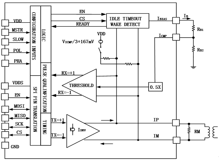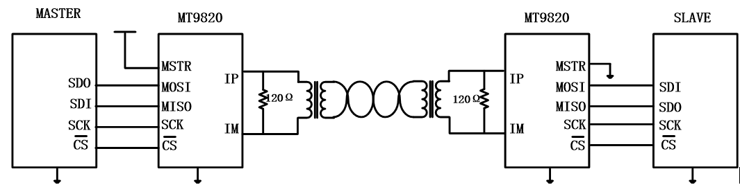 MT9820可通過單條雙絞線連接在兩個隔離器件之間提供雙向SPI通信。每個MT9820將邏輯狀態(tài)編碼為信號,并跨越一個隔離勢壘將信號傳送至另一個MT9820。接收MT9820 對傳輸信號進(jìn)行譯碼并把從總線驅(qū)動至適當(dāng)?shù)倪壿嫚顟B(tài)。隔離勢壘可利用一個簡單的脈沖變壓器進(jìn)行橋接,以實現(xiàn)幾百伏的隔離度。