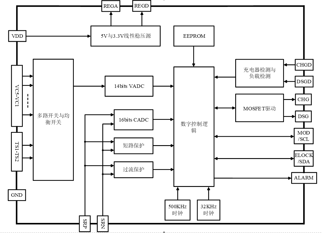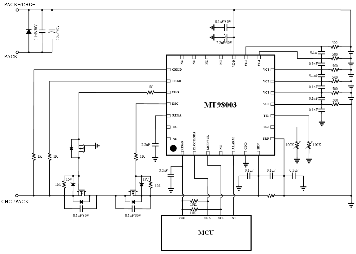 MT98003是一款專為鋰電池BMS設(shè)計(jì)的模擬前端芯片,全功率工作狀態(tài)電流小于250uA,待機(jī)狀態(tài)工作電流小于150uA,休眠狀態(tài)工作電流小于15uA,支持3~5節(jié)串聯(lián)電池監(jiān)測(cè)以及2通道溫度監(jiān)測(cè)。內(nèi)部集成一個(gè)14位VADC,用于測(cè)量電池電壓和溫度,以及一個(gè)分辨率可配置(16/13位)的CADC用來(lái)監(jiān)測(cè)電流。MT98003集成了多種安全保護(hù)機(jī)制,可對(duì)以下安全事件執(zhí)行高精度和可靠性保護(hù):過(guò)壓、欠壓、充/放電過(guò)流、放電短路、過(guò)溫保護(hù)。MT98003集成了電子鎖功能,對(duì)于電動(dòng)自行車(chē)或者無(wú)線吸塵器等電器,通常在系統(tǒng)需要機(jī)械開(kāi)關(guān)來(lái)切斷放電路徑,本芯片提供了獨(dú)立的引腳來(lái)實(shí)現(xiàn)該功能。MT98003能夠配合MCU等主控單元在主機(jī)模式 (Host Mode) 下工作,也能工作在獨(dú)立模式 (Standalone Mode) 下,獨(dú)立完成鋰電池的監(jiān)控與保護(hù)。MT98003集成了內(nèi)部均衡技術(shù),最大內(nèi)部均衡電流為25mA,如果需要更高的均衡電流,可以使用外部均衡電路。MT98003提供I2C通訊接口,使外部主機(jī)能夠訪問(wèn)內(nèi)部寄存器,以控制芯片功能和讀取電池電壓電流等信息。