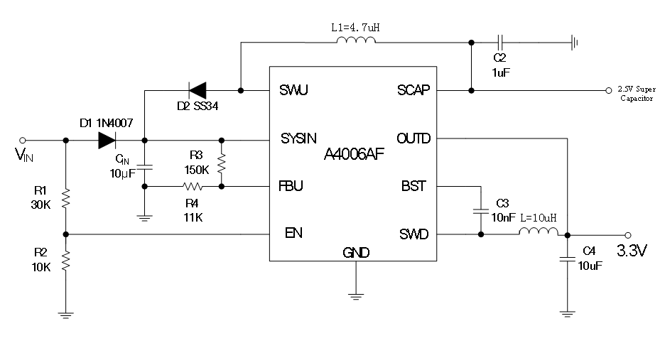 A4006AF8是一款三通道PMU芯片,將高壓Buck DC/DC供電芯片及備用電源系統(tǒng)整合到一顆芯片內(nèi)。內(nèi)部包括一個(gè)36V同步Buck降壓變換器、一個(gè)低壓?jiǎn)?dòng)18V升壓變換器和一個(gè)超級(jí)電容器充電器。buck降壓變換器能承受高達(dá)42V的輸入電壓,輸出3.3V時(shí)電流高達(dá)450mA。升壓轉(zhuǎn)換器在從2.5V超級(jí)電容器或電池供電情況下,能夠提供高達(dá)12V 500mA負(fù)載的輸出。超級(jí)電容充電器具有50mA的充電電流能力,同時(shí)具有CV功能。