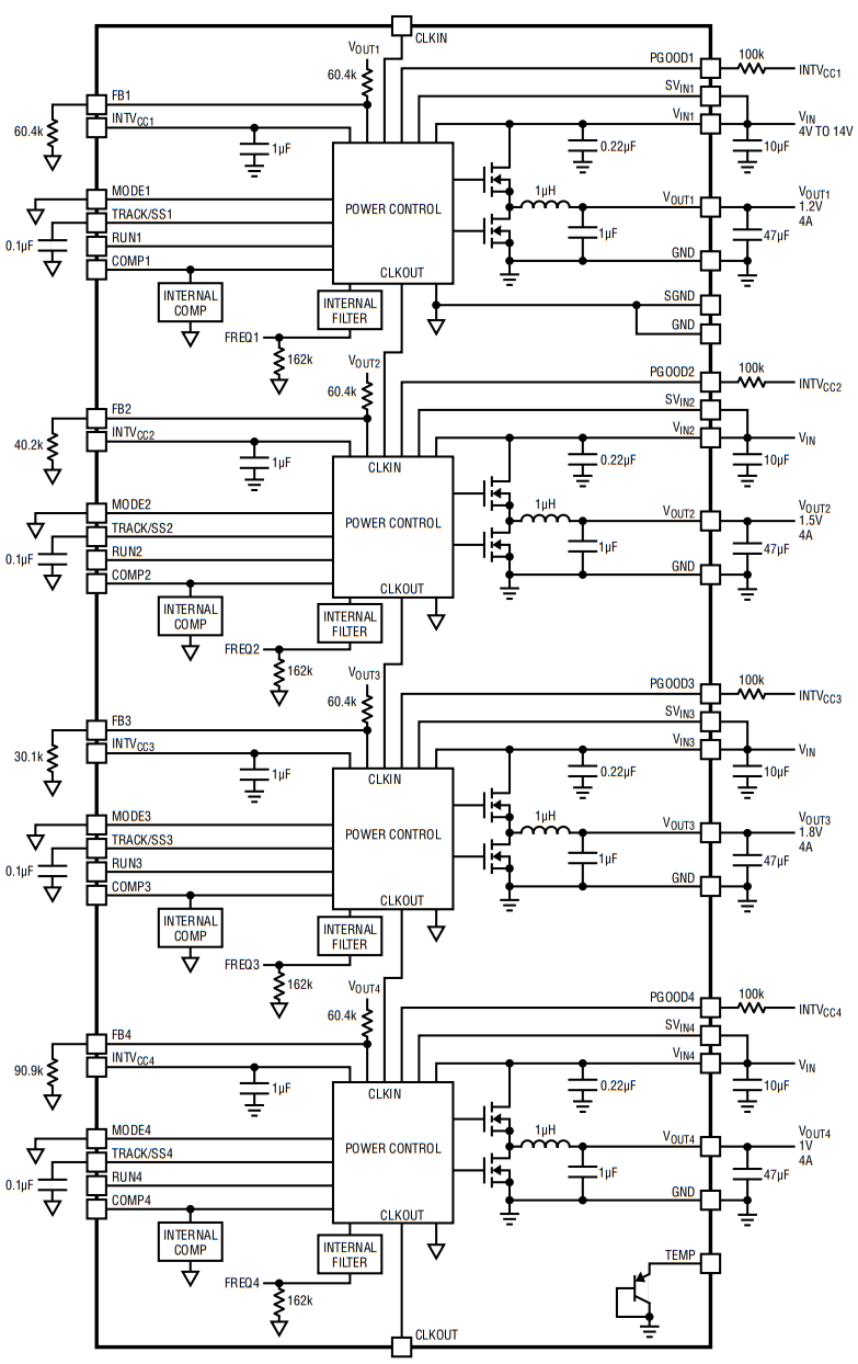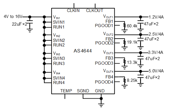 MT4644是一個(gè)四路降壓型DC/DC電源模塊,每路可輸出4A直流電流。輸出可以并聯(lián)在陣列中,以實(shí)現(xiàn)高達(dá)16A的電流能力。封裝中內(nèi)置了開關(guān)控制器、功率管、電感器和電阻電容等支持組件。MT4644可在一個(gè)4V至16V或2.4V至16V(采用一個(gè)外部偏置電源)的輸入電壓范圍內(nèi)運(yùn)作,支持一個(gè)0.6V至5.5V的輸出電壓范圍。其可為每個(gè)通道提供4A連續(xù)(5A峰值)的輸出電流。應(yīng)用時(shí)外圍僅需大容量輸入和輸出電容器。
