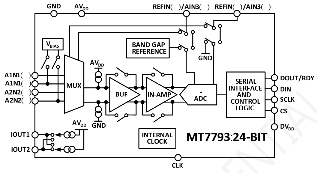 MT7793是一款適合高精度測(cè)量應(yīng)用的低功耗、低噪聲的完整模擬前端芯片。MT7793包含一個(gè)擁有三通道差分輸入的低噪聲24位Σ-Δ ADC。它集成了一個(gè)片上低噪聲儀表放大器,因此芯片也可以直接接收小信號(hào)。當(dāng)儀表放大器增益設(shè)置位64,并且更新速率為4.17Hz時(shí),均方根噪聲為40nV。芯片還內(nèi)置了一個(gè)精準(zhǔn)的低噪聲,低漂移的帶隙基準(zhǔn)電壓源,可以選擇是采用內(nèi)部基準(zhǔn)或者外部基準(zhǔn)。其他的片內(nèi)特性還包括可配置激勵(lì)電流源,熔斷電流,時(shí)鐘電路和偏置電壓產(chǎn)生器。偏置電壓產(chǎn)生器可以將通道的電壓設(shè)置成AVDD/2。芯片可以在外部時(shí)鐘或內(nèi)部時(shí)鐘下工作,可以通過軟件編程控制芯片的輸出速率,在4.17Hz至470Hz之間變化。芯片采用2.75V至5.25V電源供電,消耗的典型電流值為400μA。芯片采用16-TSSOP封裝,可在-45°C ~ 125°C的溫度范圍內(nèi)工作