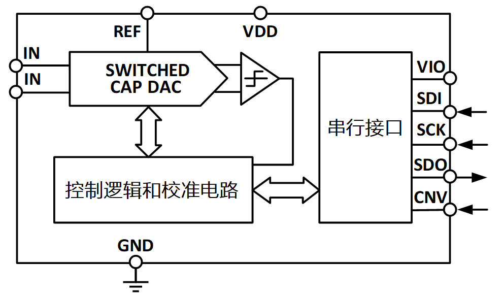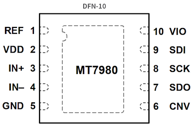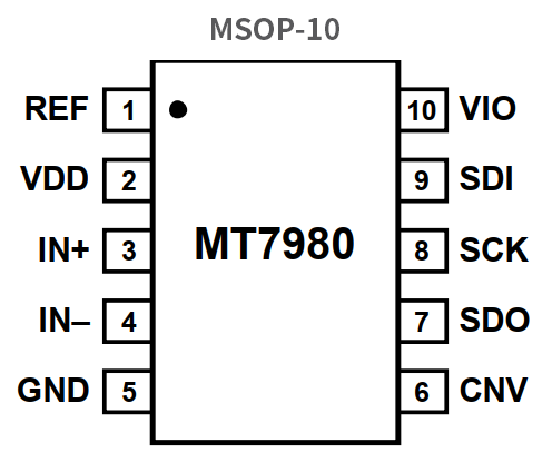 MT7980是一款16位、逐次逼近型模數(shù)轉(zhuǎn)換器(ADC),采用單電源(VDD)供電。它內(nèi)置一個低功耗、高速、16位采樣ADC和一個多功能串行接口端口。在CNV上升沿,該器件對IN+與IN- (IN-為信號的參考地) 之間的模擬輸入電壓差進行采樣,范圍從0至REF?;鶞孰妷?REF)由外部提供,并且可以獨立于電源電壓(VDD)。