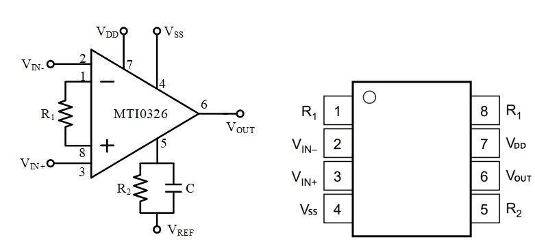 圖2 MTI0326 SOP8封裝示意圖 MTI0326的主要性能指標(biāo)如下(R1=2kΩ,R2=100kΩ,G=100,典型值): → 電源電壓范圍:2.7V~5.5V → 靜態(tài)電流 :2.3mA → 輸入失調(diào)電壓:5uV → 輸入失調(diào)電壓溫漂:0.1μV/℃ → 輸入偏置電流:300pA → 共模抑制比:114dB → 增益范圍:0.1~10000 → 增益誤差:0.06% → 0.1Hz~10Hz積分噪聲:0.6uVpp → 輸入共模范圍:(VSS-0.02)~(VDD+0.1) → 工作溫度:-55°C ~ +125°C